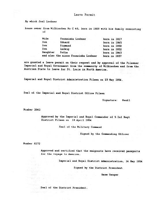 | Exit Visa of Joseph Loebner in English |